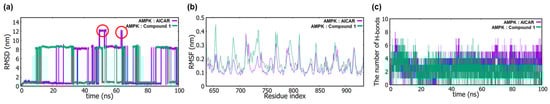 In molecular dynamics, the root-mean-square deviation (RMSD) is an indicator of the stability of a protein complex. The smaller the RMSD value is, the more stable the interaction becomes [37]. Although AICAR and compound 1 usually showed different stability during the simulation (100 ns), unstable regions were observed around 50 and 60 ns for AICAR, which means compound 1 forms a more stable complex with the AMPK protein. Root-mean-square fluctuation (RMSF) quantifies how much a ligand moves from its average position over time in a molecular dynamics simulation [38]. As compound 1 shared similar fluctuation patterns in the several residue index, it can have a similar activity as the AICAR against AMPK (Figure 5b). The number of hydrogen bonds between the ligands (AICAR and compound 1) and AMPK were predicted. As shown in Figure 5c, compound 1 usually formed more hydrogen bonds with AMPK in 0–30 ns, and AICAR established more hydrogen bonds with AMPK after 40 ns. These results indicated that both AICAR and compound 1 can be potent AMPK activators.