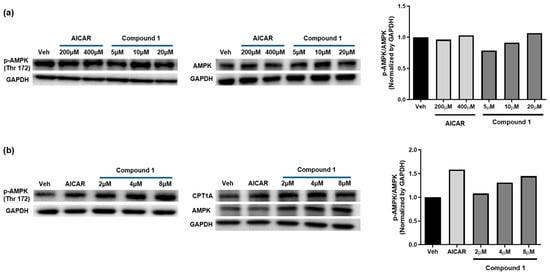 AMPK activation by AICAR (the control) and compound 1. The AMPK activation was evaluated by measuring AMPK phosphorylation (pAMPK) in the presence of AICAR and compound 1 using Western blotting. (a) The concentration of AICAR was 200 and 400 μM. The concentrations of compound 1 were 5, 10, and 20 μM. The ratio of p-AMPK/AMPK was measured after normalization of p-AMPK and AMPK to GAPDH, respectively. (b) The concentration of AICAR was 500 μM, and the concentrations of compound 1 were 2, 4, and 8 μM. p-AMPK: phosphorylated AMPK. CPT1A: carnitine palmitoyl transferase 1A.