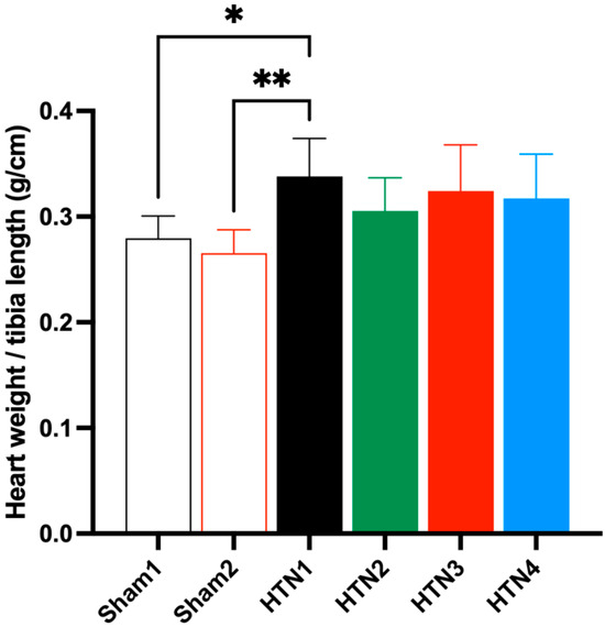 Cardiac hypertrophy indices of normotensive and hypertensive rats determined as the ratio of heart weight (g) to tibia length (cm). Normotensive rats were submitted to Sham surgery and treated with the carrier alone (Sham 1) or with 300 mg/kg Kalanchoe crenata extract (Sham 2). Hypertensive rats were submitted to the two-kidney one-clip (2K1C) procedure and treated with the carrier alone (HTN 1), with 300 mg/kg K. crenata extract (HTN 2), with 10 mg losartan (HTN 3), or with 300 mg/kg K. crenata extract and 10 mg losartan (HTN 4). Significant differences in relation to HTN1 are indicated by asterisks as follows: p < 0.05 (*) and p < 0.01 (**).