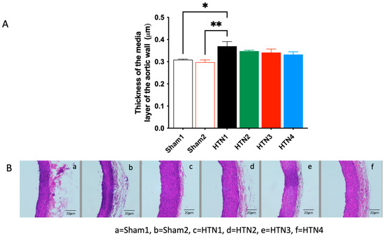 Cardiac hypertrophy indices were similar for all animals in the HTN groups regardless of the treatment applied, namely carrier (HTN 1), K. crenata extract (HTN 2), losartan (HTN 3), or K. crenata extract with losartan (HTN 4) (Figure 2). However, the indices of all HTN animals were significantly higher than those of both Sham 1 animals treated with carrier (p < 0.05) and Sham 2 animals treated with K. crenata extract (p < 0.01). These results imply that the induction of hypertension using the 2K1C model was successful. A similar situation was observed regarding the thickness of the middle layer of the aortic wall, the values of which were similar for all animals in groups HTN 1–4, regardless of the treatment applied, but significantly greater than those of Sham 1 (p < 0.05) and Sham 2 (p < 0.01) animals (Figure 3).