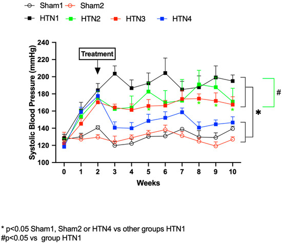 Animals were anesthetized (0.2 mL of ketamine chloride and 0.1 mL of xylazine hydrochloride applied intraperitoneally) and immediately underwent surgery to induce renovascular hypertension according to the 2K1C model described by Goldblatt et al. [49]. Unilateral renal stenosis was performed by placing a silver clip (0.2 mm i.d.) around the left renal artery, following which a single dose of oxytetracycline (0.2 g/kg) was administered intramuscularly. Sham-operated rats underwent a similar surgical procedure but without the placement of the renal artery clip. Two weeks after surgery, the animals were separated into two categories, namely hypertensive (HTN) with SBP ≥ 150 mmHg and normotensive (Sham) with SBP < 150 mmHg.