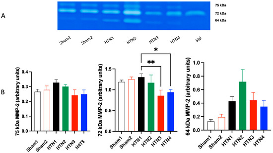 The SBP values recorded over the 10-week experimental period (Figure 4) demonstrated that rats treated with a combination of K. crenata extract and losartan (group HTN 4) presented significantly reduced SBP at the third week of administration onwards, with values that were similar to those of the Sham 1 and Sham 2 groups. Zymography of MMP2 in aortic tissues revealed that the activities of the 72 kDa isoform were reduced significantly in hypertensive animals treated with losartan (group HTN 3; p < 0.01) or with a combination of K. crenata extract and losartan (group HTN 4; p < 0.05) (Figure 5). In contrast, no changes in the activities of the 75 kDa and 64 kDa MMP2 isoforms were observed in any of the treatment groups.