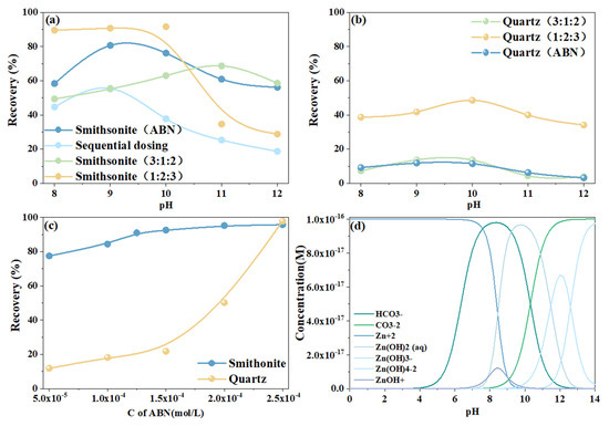 Figure 1c shows that under low-concentration conditions, the recovery difference between smithsonite and quartz was the greatest, indicating that ABN exhibits strong selectivity at low concentrations. Furthermore, as the ABN concentration increased, the recovery rate of gangue minerals increased significantly, with a noticeable upward trend at 1.5 × 10−4 mol/L. These results confirm that ABN demonstrates strong selectivity at low concentrations, while at higher concentrations, its collecting capacity is enhanced.