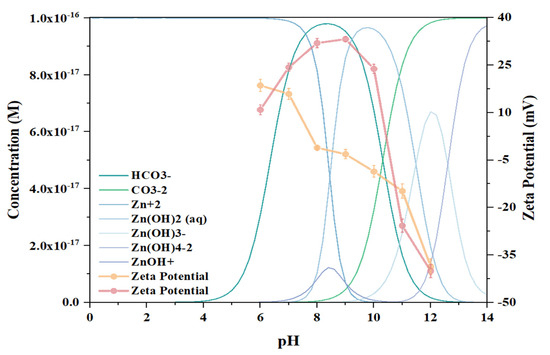 The isoelectric point (IEP) of untreated smithsonite is approximately 7.9, aligning with findings from earlier research [27,28]. Notably, when the pH surpasses 10, there is a significant reduction in the Zeta potential as pH levels rise. This phenomenon can primarily be attributed to the dissolution characteristics of smithsonite, the formation of surface charges, and the hydrolysis reactions involving dissolved ions during the dissolution process, which collectively contribute to the observed trend [29,30].