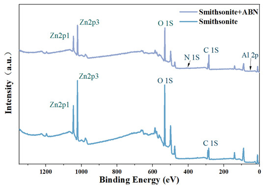 The smithsonite samples and ABN reaction samples were analyzed by XPS. An amount of 2 g of minerals with particle size of 37 μm was placed in a 50 mL beaker, the pH was adjusted to 9, ABN was added to react for 3 min, and then the samples were filtered, rinsed three times with deionized water, and dried in a vacuum oven. The XPS analysis equipment used for the dried samples was a Thermo Scientific K-Alpha (Waltham, MA, USA). The analysis of X-ray photoelectron spectroscopy results was conducted utilizing the AVANTAGE (5.9931.0.6755) software, with calibration performed against the standard binding energy of C-C, which is established at 284.80 eV [49].