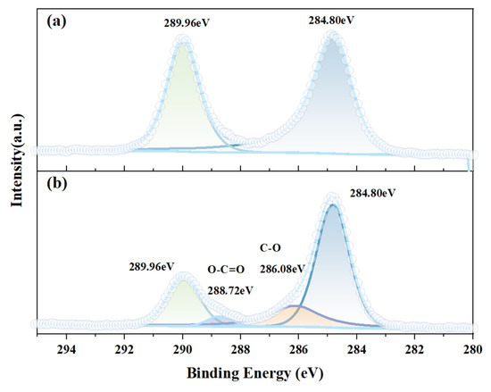 The fine spectrum of smithsonite C 1s is illustrated in Figure 4, showcasing the results before (a) and after (b) the application of ABN treatment. In Figure 4a, the spectrum reveals two distinct peaks corresponding to the smithsonite sample that underwent treatment with deionized water at a pH of 9; these peaks represent carbon associated with the C-(C, H) bond at 284.80 eV and the carbonate ion (CO32−) at 289.96 eV within the ZnCO3 structure. Conversely, in panel (b), the spectrum displays four peaks, including the previously mentioned carbon (284.80 eV) and carbonate (289.96 eV) signals, along with additional peaks for O-C=O at 288.72 eV and C-O at 286.08 eV, indicating the presence of new bonding configurations in the smithsonite sample treated with ABN under identical conditions. The O-C = O group comes from the carboxyl group of the oleic acid component (NaOL), and the C-O group comes from BHA and NaOL. BHA exhibits tautomeric forms characterized by the groups -C=N- or -C=O. Upon interaction with metal ions, BHA forms a chelate that result in a multi-ring configuration, wherein the five-membered ring structure demonstrates a greater degree of stability compared to other possible arrangements [32]. The emergence of the C-O bond at 285.44 eV, as illustrated in Figure 4b, substantiates the notion that ABN predominantly adheres to the mineral surface in a five-membered ring configuration throughout this process. The XPS results distinctly illuminate that both components, BHA and NaOL, within ABN are present on the surface of smithsonite.