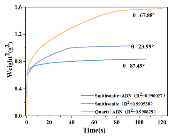Samples were prepared under controlled conditions with a pH of 9, including three groups: pure smithsonite, smithsonite with 0.5 mL of ABN, and quartz with 0.5 mL of ABN. Each sample group was meticulously weighed to ensure a minimum mass of 6 g. Following preparation, the contact angles of the samples were measured. During the determination process, 2 g of samples was taken each time for one capillary constant measurement and one contact angle measurement. Anhydrous ethanol was used as the wetting liquid for capillary constant measurement, and deionized water was used as the wetting liquid for contact angle measurement [51].