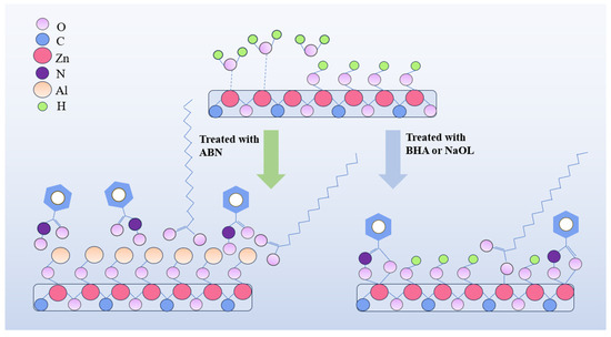 The adsorption of ABN [23] on the mineral surface primarily occurs through three mechanisms: single-component adsorption, binary complexation adsorption, and multivariate complexation adsorption. The benzene ring of BHA and the Carboxyl group of NaOL can form hydrogen bonds, resulting in high-molecular-weight complexes that adsorb onto the mineral surface.