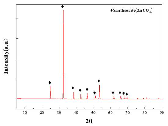 XRD analysis was conducted to assess the purity of the mineral samples, and the results are presented in Figure 9. The findings indicate that the crystalline substances corresponding to each diffraction peak are primarily smithsonite (Figure 9).
