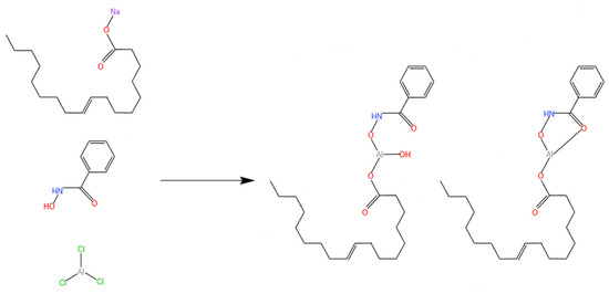 In the direct flotation of smithsonite, polar collectors, including fatty acids and their derivatives, as well as hydroxamic acid collectors, are commonly employed. Fatty acids and their derivatives exhibit strong collecting efficacy yet demonstrate limited selectivity for smithsonite [14,15]. In contrast, the unique molecular structure of hydroxamic acid collectors allows for chelation with metal ions, altering the surface characteristics of the minerals and enhancing the adhesion between bubbles and minerals. Although hydroxamic acid exhibits superior selectivity in the flotation of smithsonite, its collecting efficacy is comparatively diminished [16,17,18,19,20]. Consequently, the quest for effective collectors to separate and purify smithsonite more accurately and efficiently is a key area of investigation in the realm of the direct flotation of smithsonite. Studies have demonstrated that a 2:1 molar ratio of sodium oleate (NaOL) to benzyl hydroxamic acid (BHA) significantly enhances the flotation effect [21,22]. This synergistic interaction reduces gas–water interfacial tension, increases the surface activity of minerals, and markedly improves the enrichment effect on smithsonite after sulfidation modification. However, the application of the binary compound reagent BHA/NaOL necessitates a sulfidation reaction on the minerals to achieve optimal flotation performance.