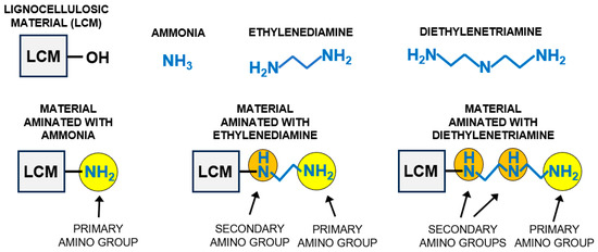 Structural formulas of aminating agents (ammonia, ethylenediamine, and diethylenetriamine) and a simplified diagram of materials modified with selected aminating agents.