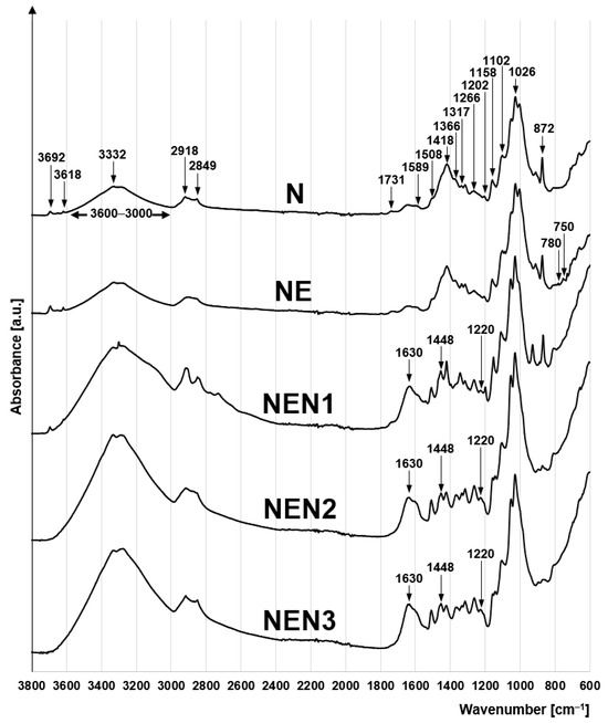 Characteristics of the NEN1, NEN2, and NEN3 spectra are the peaks at 1448 cm−1 and 1220 cm−1, indicating the stretching of the C–N bond, and the peak at 1630 cm−1, which can be ascribed to the shear vibrations of NH2 [69,70] (Figure 2). The presence of these peaks confirms that the modified material has undergone the amination process.