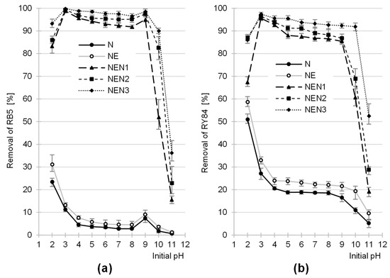 In the analytical series with RB5, a slight increase was observed in the sorption efficiency at pH 9. For each sorbent tested, the sorption efficiency of RB5 and RY84 was the lowest at pH 11. Regardless of the initial pH, the sorption efficiency of the dyes on the tested sorbents increased in the following order: N < NE < NEN1 < NEN2 < NEN3.