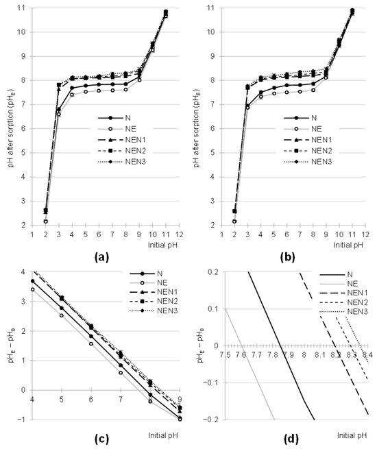 The changes in the pH values of the solutions observed in the systems are due to the fact that the sorbents contain functional groups capable of ionization. As mentioned above, some functional groups were protonated at low pH. One of the effects of this process was a decrease in the concentration of hydronium ions and thus an increase in the pH value of the solution. Conversely, at a high pH value, some functional groups were deprotonated, which led to a decrease in the concentration of hydroxyl ions and thus to a decrease in the pH value of the solution. The final pH value in the system always depends on the ratio between the alkaline and acidic groups on the surface of the sorbent. The system always tends to a solution pH that is close to the pHPZC of the sorbent (PZC—point of zero charge). It can be said that the pHPZC is the pH value at which the surface of the sorbent has a neutral charge (the number of protonated groups is equal to the number of deprotonated groups). The pHPZC values determined by the “drift” method in the present study were pHPZC = 7.84 for N, pHPZC = 7.60 for NE, pHPZC = 8.20 for NEN1, pHPZC = 8.30 for NEN2, and pHPZC = 8.34 for NEN3 (Figure 4c,d).