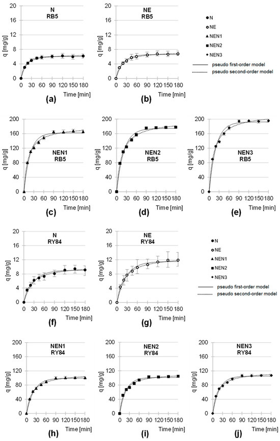 Sorption kinetics of RB5 sorption onto (a) N, (b) NE, (c) NEN1, (d) NEN2, and (e) NEN3; and of RY84 sorption onto (f) N, (g) NE, (h) NEN1, (i) NEN2, and (j) NEN3, (average). Pseudo-first-order model and pseudo-second-order model. Temp. 25 °C.