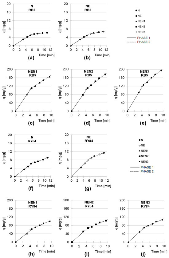 The slightly longer sorption times of RY84 compared to RB5 observed in the research series with N and NE could be due to the higher molecular weight of RY84. The larger dimensions of the RY84 molecules could slow down the process of their binding to the sorption centers in deeper layers of the sorbent.