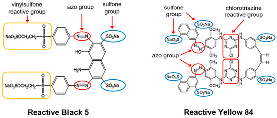 Due to the imperfections of the dyeing methods currently in use, a significant proportion of the dyes used in this process do not bind with the material and end up in post-production wastewater. This is particularly true for anionic reactive dyes, whose losses during dyeing range from 10% to even 50% [6]. Incorrectly managed colored industrial wastewater can pose a significant threat to the natural environment. The dyes used in industry are generally organic compounds with a complex chemical structure, which makes them resistant to biodegradation [7]. For this reason, their significant proportion can persist in the environment for a long time [8]. Pollution with dyes is particularly dangerous for natural waters. Dyes dissolved in water restrict the access of aquatic autotrophs to sunlight, resulting in a low efficiency of primary production [9]. Some dyes can react with dissolved oxygen in the water, which—in combination with inhibited photosynthesis—can lead to the development of anaerobic conditions in the reservoir [10]. Individual dyes can also be toxic to aquatic flora and fauna [11]. Consequently, environmental contamination with dyes can lead to the collapse of the local aquatic ecosystem.