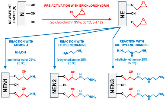 - Newsprint paper pre-activated with epichlorohydrin and next aminated with diethylenetriamine (NEN3).