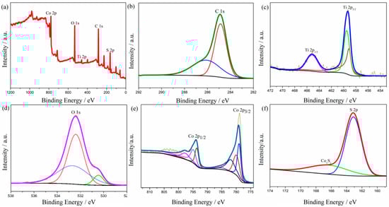 The chemical composition and valence states were characterized by X-ray photoelectron spectroscopy (XPS), and the corresponding results are shown in Figure 3. The survey spectrum displays the existence of C, Ti, O, Co, and S elements in the composite (Figure 3a). As shown in Figure 3b, the bond energy of the main peak in the detail in the figure of C 1s is 284.60 eV [37], which corresponds to the carbon–carbon single bond or carbon–carbon double bond contained in the skeleton structure of the fiber after carbonization. In addition, the characteristic peak of the carbon–oxygen double bond appeared at a 286.20 eV binding energy, which may be because of the existence of hydroxyl residues in the composite after the hydrothermal reaction. Figure 3c shows that the binding energy of Ti 2p is 459.4 eV and 465.2 eV, corresponding to Ti 2p3/2 and Ti 2p1/2, respectively [38]. The difference in binding energy is 5.8 eV, indicating the existence of tetravalent titanium ions, which proves the existence of titanium dioxide. Figure 3d shows the detail of the spectrum of O 1s. The characteristic peak at 530.5 eV is the Ti–O bond of TiO2 [39]. Figure 3e is the detailed spectrum of Co 2p. The characteristic peak at 778.8 eV is a Co–S bond, which proves that cobalt and sulfur form cobalt sulfide [40]. The peak at 163.1 eV is the typical characteristic of S 2p of CoS. The broad peak at 165~170 eV may come from a small amount of nonstoichiometric CoxSy [36].
