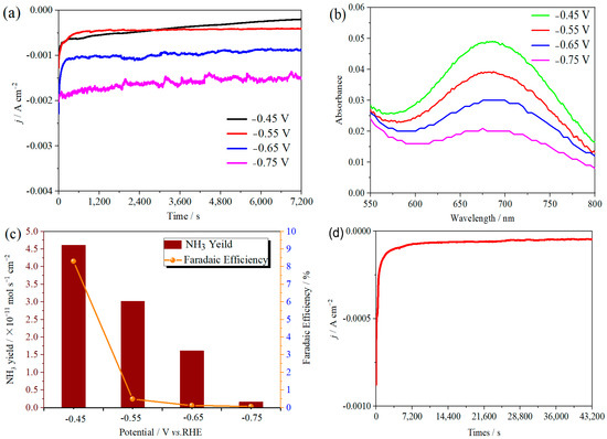 (a) Time-dependent current density curves, (b) UV–vis spectra, and (c) ammonia yields and Faradaic efficiencies of the CNF/TiO2@CoS nanofibrous membrane at different potentials. (d) Time-dependent current density curve for CNF/TiO2@CoS in 0.1 M Na2SO4 electrolyte at −0.45 V vs. RHE for 12 h.