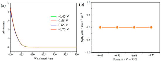 The ambient nitrogen reduction was conducted in a H-type electrolytic cell, in which a CNF/TiO2@CoS nanofibrous membrane (0.5 × 0.5 cm2) was directly used as the working electrode. The electrolyte (0.1 M Na2SO4) was saturated with high-purity (99.999%) nitrogen for the polarization test. The potentiostatic polarization curves are shown in Figure 4a. After 2 h electrolysis, the electrolyte in the cathodic compartment was sampled and subjected to the indophenol blue method to determine the NH3 yield. After being stained with the indophenol indicator, it was found that the concentration of the NH3 solution was linearly related to its absorbance. Furthermore, the UV–vis spectra of the electrolytes obtained at different electrolytic conditions from −0.45 to −0.75 V vs. RHE are shown in Figure 4b. It was found that the highest NH3 yield was 4.61 × 10−11 mol s−1 cm−2 at −0.45 V vs. RHE. At the same time, the highest Faradaic efficiency was 8.3% at −0.45 V vs. RHE, as shown in Figure 4c. As the association mechanism of the electrocatalytic nitrogen reduction mechanism can be divided into the two ways of distal hydrogenation and alternate hydrogenation, according to the different hydrogenation sequence, hydrazine may be produced as a by-product [41]. Thus, to test the selectivity of the CNF/TiO2@CoS nanomaterials, the electrolyte after 2 h electrolysis was sampled and subjected to the Watt and Chrisp method to determine the presence of N2H4 [36]. As shown in Figure 5, hydrazine was not detected from the electrolyte, and the N2H4 yield in the electrolyte was nearly zero, which indicated the exclusive selectivity of the CNF/TiO2@CoS nanofibrous membrane toward NH3 [36]. The durability and repeatability over 12 h at the optimal potential were investigated. As shown in Figure 4d, during the long-term test over 12 h, the current density did not decay much, which is attributed to the good structural stability of the composites. After waiting for 20 min under dark conditions, the electrolytes were subjected to a UV test, and the absorbance curves are shown in Figure 5. There was no indication of absorbance at 458 nm, suggesting that the yield of hydrazine in electrolyte is almost zero and that the catalyst has good selectivity towards ammonia. As shown in Figure 6, after five repeated test cycles at the optimum potential of −0.45 V vs. RHE, the ammonia yield and Faraday efficiency of the nanofiber membrane slightly decreased, indicating that the electrocatalyst has good reusability. To compare the electrocatalytic performance of different working electrodes of CNF, CNF/TiO2, and CNF/TiO2@CoS, the UV–vis spectra of the electrolytes collected at −0.45 V vs. RHE are presented in Figure 7. It can be seen that the highest NH3 yield and the higher FE were observed with the presence of CoS. Figure 8 shows the absorbance curve of hydrazine after the long-term test of the composite material. It can be seen from the figure that no by-products were produced in the electrocatalytic process, which further indicates that the electrocatalyst has a good ammonia selectivity.