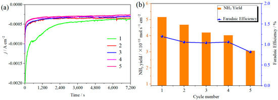 (a) Current density time curves; (b) ammonia yield and Faraday efficiency of CNF/TiO2@CoS in 0.1 M Na2SO4 at −0.45 V vs. RHE. for 2 h and five times.