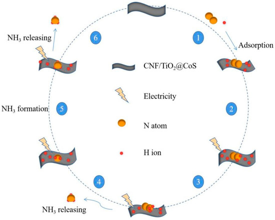 Proposed pathway for the NH3 synthesis using CNF/TiO2@CoS catalyst.