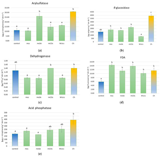 Soil enzyme activity levels. (a) Arylsulfatase; (b) β-glucosidase; (c) dehydrogenase; (d) FDA; (e) acid phosphatase. For description of treatments, see Table 1. Different letters above bars indicate statistically significant differences (p ≤ 0.05, Tukey’s test).