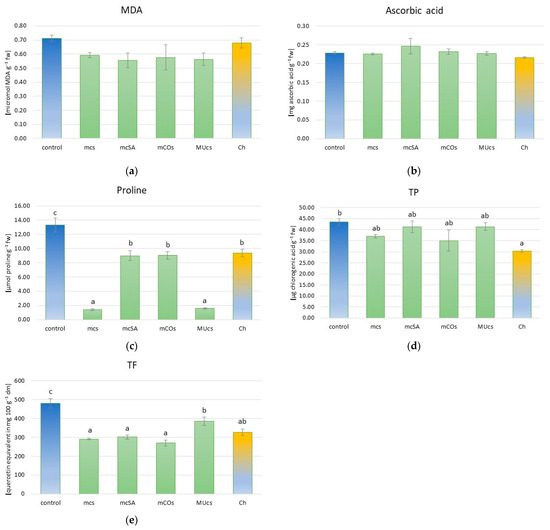 There was no significant effect of the tested protection methods on the content of MDA and ascorbic acid in broad bean leaves (Table S6, Figure 2a,b). However, significant differences in proline content were noted between the treatments (Table S6, Figure 2c). The highest content of this compound was noted in the control plants. Significantly lower content was noted in the leaves of broad beans from the mSA, mCOs, and chemically protected treatments (a decrease of about 45%). In contrast, in broad beans from the mcs and MUcs treatments, the proline content was about 9- and 8-fold lower, respectively. The TP content did not differ significantly between the protection methods, except for chemical protection. In the latter treatment, the TP content was the lowest and was significantly lower than in the control (Figure 2d). The TF content was the highest in the control plants. All applied protection methods significantly reduced the contents of these compounds in the following order: control > MUcs > Ch > mcSA > mcs > mCOs (Figure 2e).