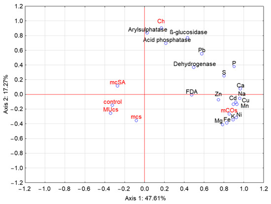 A principal component analysis (PCA) of the element levels and enzymatic activity of the soil for the different protection variants allowed for the identification of four principal components, two of which explained 64.88% of the variation in the analyzed samples (Figure 3). The elements studied were positively correlated with the first ordination axis. The same was true for the soil enzymes, although this correlation was weaker. In contrast, the soil enzymes (with the exception of FDA) and Pb, S, and P were clearly positively correlated with the second ordination axis. Elements such as Mg, Fe, K, and Ni, on the other hand, were negatively correlated with this axis. PCA also confirmed the positive effect of the CO-dominant mixture on the contents of Mg, Fe, K, and Ni in particular, and of chemical protection on the activity of the enzymes, such as arylsulfatase, β-glucosidase, and acid phosphatase.