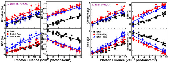 Representative exposure–response curves for different DNA conformations resulting from X-ray irradiation of plasmid DNA surrounded by O2 at SATP and 100% relative humidity (Γ = 33) are shown in Figure 1. The curves recorded on glass and Ta appear in A and B, respectively. The black squares denote the yields of the specific conformations measured by electrophoresis without enzyme treatment, while the blue triangles and red circles correspond to the yields after treatment of the samples with Nth (▲) and Fpg (●) enzymes, respectively. Similar curves were also recorded at Γ = 2.5, 10, and 20. All exposure–response curves indicate that, within experimental errors, the yields per photon·molecule·cm−2 of respective lesions are linear with X-ray fluence, i.e., they are induced by a single event. The data of Figure 1 consist of 961 points from four irradiation experiments, with an average of 30 samples for one exposure at Γ = 33. For all hydration levels, the total number of measurements amounts to 9048 (12,064 including heat liable). The data points at zero fluence represent the initial plasmid conformations, plus the yields of lesions created by manipulations. These lesions do not influence the determination of the G-values, which arise from the slope of the fluence–response curves.