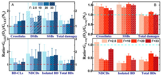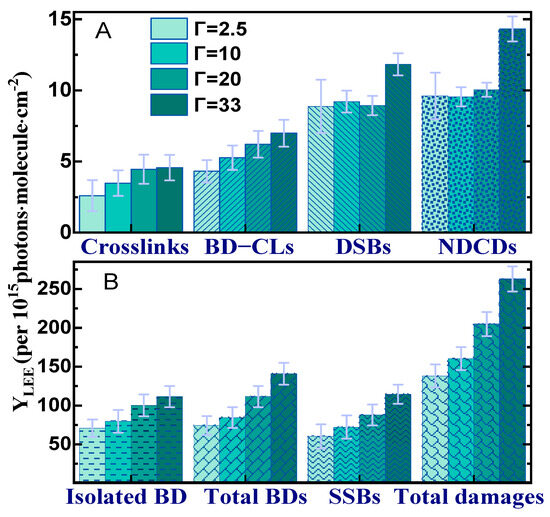 Figure 2 shows as histograms the yields of the lesions induced by the LEE interaction with DNA (YLEE) in an oxygen atmosphere under the four hydration levels. The yields in Figure 2B are at least one order of magnitude larger than those shown in Figure 2A. Apart from DSBs and NDCDs, whose yields become larger only at Γ = 33, YLEE increases progressively as a function of hydration. As expected, the increase in single damages is reflected in the total yields, indicating that in the presence of oxygen, the most prominent DNA damages are proportional to the magnitude of Γ. A similar behavior was found in an N2 atmosphere, but only up to Γ = 20 [56].