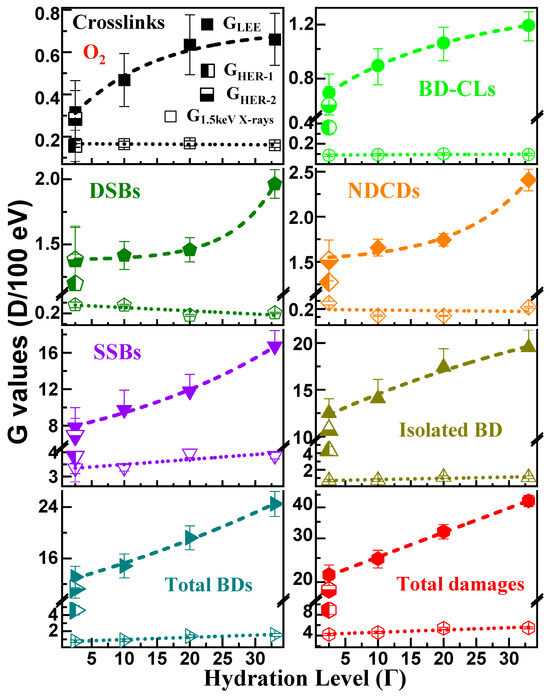 G-values (number of a specific damage D per 100 eV of energy deposited) recorded under O2 at SATP, as a function of hydration level Γ, for LEPEs (GLEE, full symbols) and 1.5 keV X-rays (GX, open symbols). The GHER-1 and GHER-2 values were obtained at Γ = 2.5 for electron distributions created by the initial and all secondary electrons produced by HER, respectively (half-filled symbols). The G-values are provided for crosslinks (CLs), SSBs, DSBs, BD-related CLs, isolated BDs, non-DSB cluster damages (NDCDs), total BDs, and total DNA damages. The dashed lines are splined curves fitted to the data points. The error bars are the standard deviations resulting from six identical experiments.