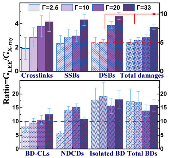 Furthermore, the dependence on Γ of the direct or indirect effects shows a different behavior depending on the lesion (Figure 5), i.e., CLs exhibit an exponentially saturating behavior of indirect damage, whereas an opposite trend is observed for DSBs and NDCLs, with a strong increase from Γ = 20 to 33. SSBs, the sum of BDs, and the total of all lesions display a nearly linear dependence on hydration. The direct effect contributes to 86%, 67%, and 50% of the total damages at Γ = 10, 20, and 33, respectively. The present behaviors of DSBs, NDCDs, SSBs, and BDs were not observed in an N2 atmosphere, where the magnitude of the indirect effect quasi-exponentially saturates vs. Γ for all lesions [56].