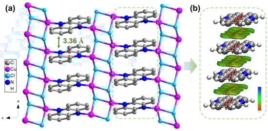 (a) The 2D layer structure of compound 1 as viewed along the b axis. (b) A selected π–π stacking fragment within compound 1, along with its calculated gradient isosurfaces (s = 0.5 a.u.). The surfaces are colored using a blue–green–red (BGR) scale based on the values of sign (λ2)ρ, which range from −0.04 to 0.02 a.u. In this scale, blue indicates strong attractive interactions, green represents moderate attractive interactions, and red signifies strong non-bonded overlaps.