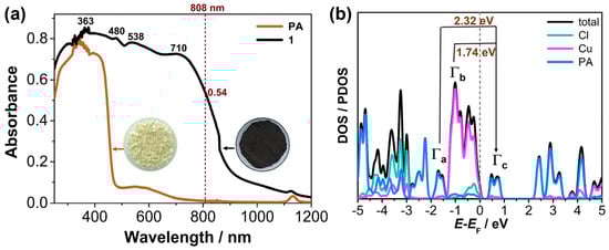 Interestingly, the crystalline powder sample of compound 1 appears black under ambient conditions (Figure 2a). Solid-state UV-Vis-NIR spectra reveal that compound 1 exhibits a broad optical absorption band spanning from the ultraviolet to the near-infrared region, with an absorption edge extending to 1200 nm, in contrast to the ligand PA (Figure 2a). To investigate the origin of this broad absorption spectrum, the absorption peaks were analyzed and assigned. The absorption peaks at 363 nm and 480 nm were attributed to the intrinsic absorption of the PA ligand. Density of states (DOS) and partial DOS (PDOS) calculations indicated that the Γa and Γc states primarily arise from the mixed antibonding pπ orbitals of the PA ligands, while the Γb states originate from the d orbitals of Cu(I) (Figure 2b and Figure S4). As a result, the absorption peak at 538 nm (2.3 eV) was attributed to the transfer from the Γa state to the Γc state, corresponding to the ligand-to-ligand charge transfer (LLCT) among the PA ligands. The absorption peak at 710 nm (1.746 eV) was attributed to the transfer from the Γb state to the Γc state, corresponding to the metal-to-ligand charge transfer (MLCT) from the Cu(I) to the PA ligands (Figure 2b and Figure S4). And the strong intermolecular π–π interactions among the coordinated PA ligands (Figure 1b) may further extend and broaden the absorption edge [30]. Therefore, the broad-spectrum absorption of compound 1 results from the combined contributions of MLCT and intermolecular π–π interactions.