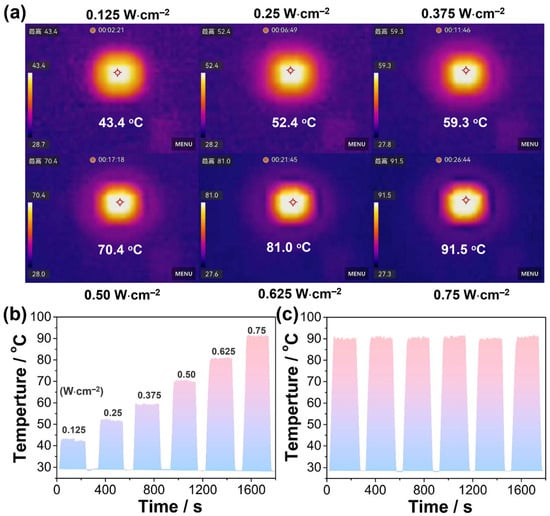 (a) Infrared images of a crystalline pellet of 1 under varying irradiation power densities. (b) Temperature variations in 1 under 808 nm laser irradiation at different power densities. (c) Cycling temperature profile of 1 under 808 nm laser irradiation with a constant power density of 0.75 W/cm2.