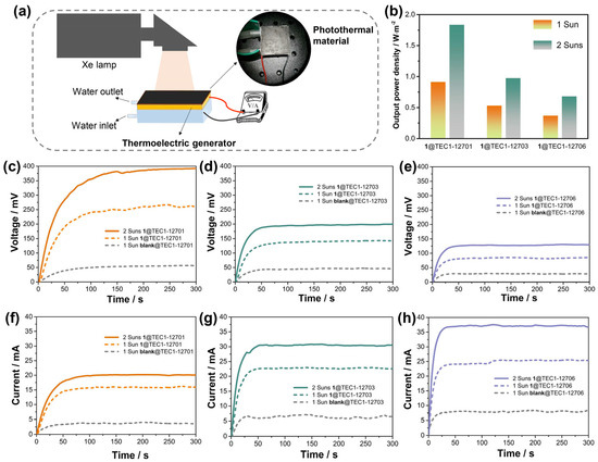 (a) Schematic diagram of photo−thermo−electric conversion device. (b) The output power density of different photo−thermo−electric conversion systems when loading external resistances under irradiation of 1 Sun and 2 Suns. Open−circuit voltages (c–e) and currents (f–h) of different commercial thermo−electric generators after loading with compound 1 under irradiation of 1 Sun and 2 Suns, respectively.