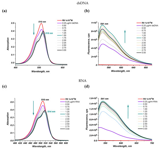 UV-VIS and fluorescence properties of dye R9 and its complexes with dsDNA (a,b) and RNA (c,d). The arrows represent the band intensity change upon an increasing NA concentration.