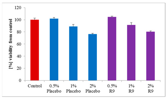 Viability of HaCaT cells treated for 30 min with placebo and R9-loaded CellInject, which contained lipid fractions of 0.5%, 1%, and 2% and dye concentration of 30 nM (mean ± SD, n = 3).