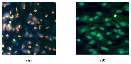 The cell culture medium was replaced every second or third day. After obtaining 80% confluency, explants were detached with 0.05% trypsin/ethylenediaminetetraacetic acid (Lonza, Gampel, Switzerland) for 15 min, cells were counted using a hemocytometer, and the total cell number was determined. Cells were transferred to 25 cm2 or 75 cm2 tissue culture flasks (TPP). Further cultivation was carried out until reaching 80% confluence. For the staining, cells at the fifth passage were seeded in 6-well plates. All experiments were performed in triplicate. Nonstained cells were used as controls.