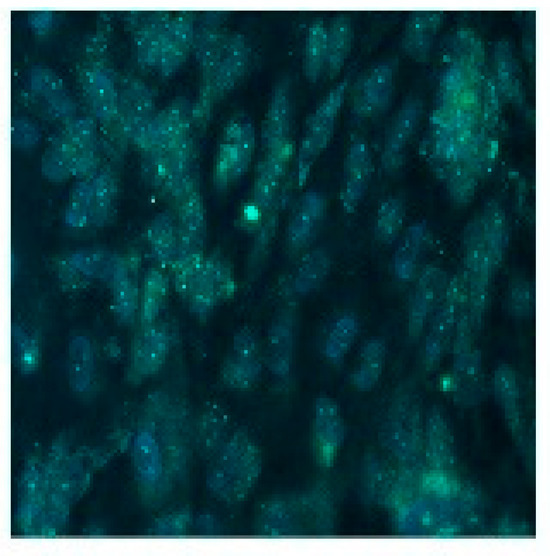 After adding dye R9 to SCAP cells, we examined the penetration through the cellular membrane and the distribution of the dye in the cell. We found that the 2 μM concentration seemed not to be sufficient for nuclear membrane penetration, as the dye remained in the cytoplasm and stained cytoplasmic structures located closely to the nuclei. The granular structure of the stained organelles resembles the granulated endoplasmic reticulum (Figure 6A). When the cells were formalin-fixed, the 2 μM dye penetrated the cell nuclei and concentrated in structures resembling the nucleoli (Figure 6B).