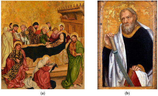 The Virgin’s mantle in Death of the Virgin (a) and Simon’s tunic (inv. 5/C) in Apostles Predella (b) are good examples showing the recurring dark and rather flat coats under study.