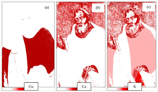 For steric reasons, the number of measurements for Duetto’s XRD was not sufficient to generate maps of compounds using SmARTscan. The XRF measurements were on the contrary sufficient. We report here the maps of copper for Apostle Simon since this painting has the most extended regions of darkened blue (Figure 5a).