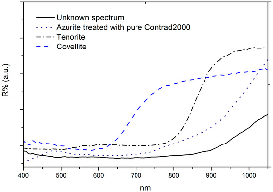 The comparison among the reflectance spectra of our tenorite sample, tenorite sample, the azurite painting treated with pure Contrad C2000, and the blackened azurite from the original work (Figure 7) show that the spectral features of tenorite are quite different. The same can be said from a comparison with the covellite reflectance spectrum, available also in the literature [47,48]. Tenorite was compared although it is not detected with XRD because it may be present below the detection limit. Even if tenorite and covellite were present in low concentration, they do not mainly contribute to characterise the reflectance spectrum as observed in the areas investigated with both XRD and FORS (Simon’s robe inv. 5/D) commented previously. On the other hand, the spectra obtained by applying Contrad 2000 on the azurite painting result in lowering the reflectance in the visible range, but not in the near-infrared range in a way comparable to the one shown in the blackened areas spectra.