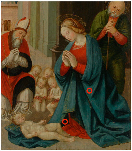 Measurement points (red circles) on the Virgin’s mantle in 483/D. FORS spectra acquired onto the light blue rope can be assigned to azurite while the dark inner part of the veil gives reflectance spectra of blackened azurite.