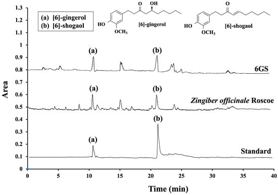 Chromatographic fingerprinting of primary derivatives of Zingiber officinale Roscoe extract and 6GS; 6GS: phytosome-encapsulated 6-gingerol- and 6-shogaol-enriched extracts from Zingiber officinale Roscoe.