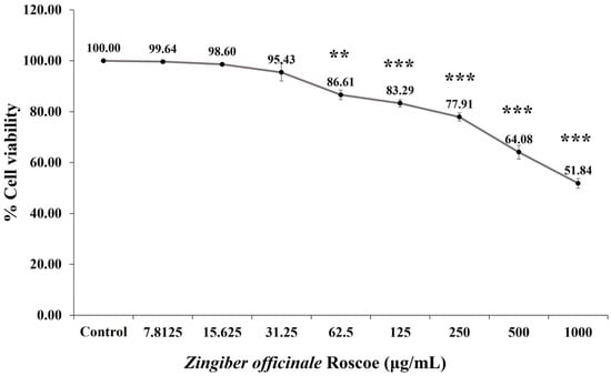The neurotoxicity of 6GS was evaluated by exposing SH-SY5Y cells to various concentrations of the extract (0, 7.8125, 15.625, 31.25, 62.5, 125, 250, 500, and 1000 µg/mL) for 24 h, as illustrated in Figure 2. The results showed a concentration-dependent decrease in cell viability: 99.64 ± 0.59, 98.60 ± 0.64, 95.43 ± 3.39, 86.61 ± 1.88, 83.29 ± 1.39, 77.91 ± 1.58, 64.08 ± 2.71, and 51.84 ± 1.91 for concentrations of 7.8125, 15.625, 31.25, 62.5, 125, 250, 500, and 1000 µg/mL, respectively. Significant reductions in cell viability were observed at concentrations of 62.5, 125, 250, 500, and 1000 µg/mL (p < 0.01, 0.001, 0.001, 0.001, and 0.001, respectively, compared to the control group). Consequently, doses of 15.625 and 31.25 µg/mL of 6GS were identified as the maximum non-toxic doses for SH-SY5Y cells. These doses were selected for further investigation to assess the protective effect of 6GS against H2O2-induced neurotoxicity.