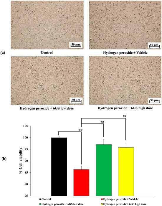 Effect of 6GS on H2O2-induced cytotoxicity in SH-SY5Y cells. (a) Light microscopy of SH-SY5Y cell density at 10× magnification. (b) Percentage of cell viability of SH-SY5Y cells. ** p < 0.01, compared to the control; ## p < 0.01, compared to SH-SY5Y cells treated with H2O2 and vehicle. H2O2: hydrogen peroxide at a dose of 200 μM; 6GS low dose and 6GS high dose: phytosome-encapsulated 6-gingerol- and 6-shogaol-enriched extracts from Zingiber officinale Roscoe at doses of 15.625 and 31.25 μg/mL, respectively.