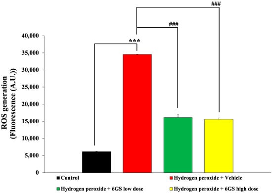 Effect of 6GS on ROS generation in SH-SY5Y cell toxicity induced by H2O2. Data are presented as mean ± SEM. *** p < 0.001, compared to the control; ### p < 0.001, compared to SH-SY5Y cells treated with H2O2 and vehicle. H2O2: hydrogen peroxide at a dose of 200 μM; 6GS low dose and 6GS high dose: phytosome-encapsulated 6-gingerol- and 6-shogaol-enriched extracts from Zingiber officinale Roscoe at doses of 15.625 and 31.25 μg/mL, respectively.